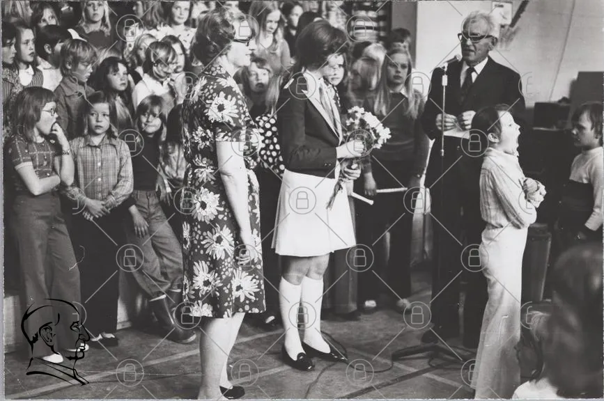barn, skolavslutning, blommor, klänning, publik, talare, 1970-tal, svartvitt, fest, tradition, glädje, samling, kläder, minnen, ungdomar, familj, ceremonin, uppträdande, fotografering, gemenskap, skola, artister, barnkör, vuxna, klippning, minnesvärd, evenemang, barnens prestationer, hyllning, samhörighet