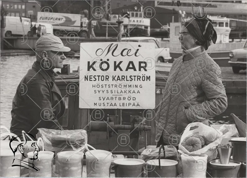 båt, människor, skylt, Nestor Karlström, Höstströmning, syyssilakkaa, svartbröd, mustaa leipää, gammal, svartvitt, hamn, fiske, tradition, mat, kultur, samtal, kläder, hatt, kvinna, man, 1900-tal, historia, skärgård, nordisk, livsstil, marknad, lokal, råvaror, försäljning
