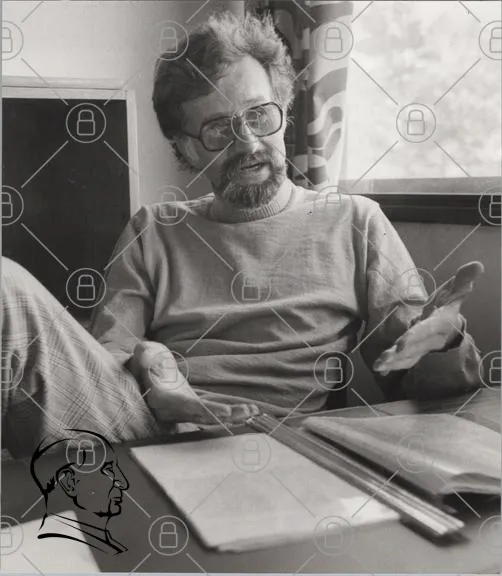 man, glasögon, pratande, gestikulerande, bok, skrivbord, fönster, svartvitt, kläder, inomhus, 1970-tal, diskussion, intellektuell, skägg, avslappnad, sittande, rum, studera, forskning, lärande