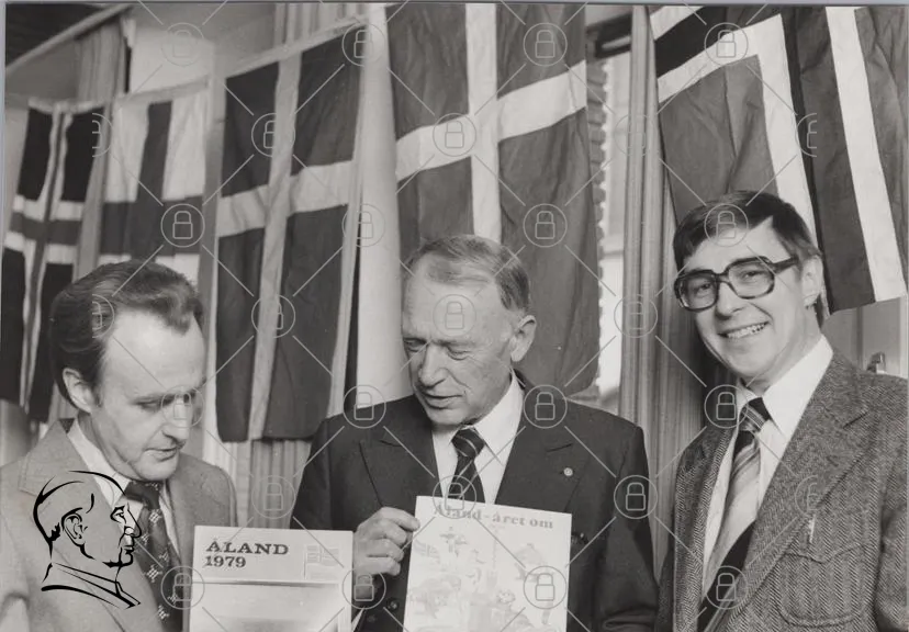 Åland, 1979, flaggor, män, möte, dokument, historia, kultur, politik, presentation, svartvitt, tidning, information, samarbete, delegation, evenemang, tradition, föredrag, utbyte, samhälle, representation, fotografi, arkiv, minnen, diskussion, officiellt, grupp, reportage, lokal
