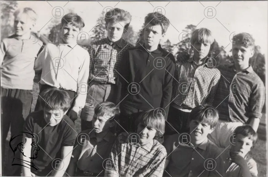 pojkar, svartvitt, grupp, ungdomar, kläder, 1960-tal, fotografering, utomhus, träd, ansikten, stil, mode, leenden, pojkband, retro, nostalgi, vänskap, gemenskap, skola, lek, minnen, ungdomstid, porträtt, naturligt ljus, samling, ungdomlig, uttryck, glädje, historia