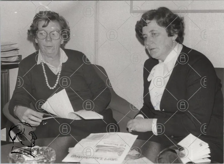 två kvinnor, svartvitt, kontor, papper, anteckningar, glasögon, kläder, diskussion, 1980-tal, professionell, möte, dokument, bord, pärmar, ansiktsuttryck, interaktion, samtal, skrivbord, arbetsmiljö, vintage, retro, kvinnor i arbete, affärsmöte, kommunikation, formell, klädkod, kontorsmiljö, historisk, kvinnligt ledarskap, samarbete
