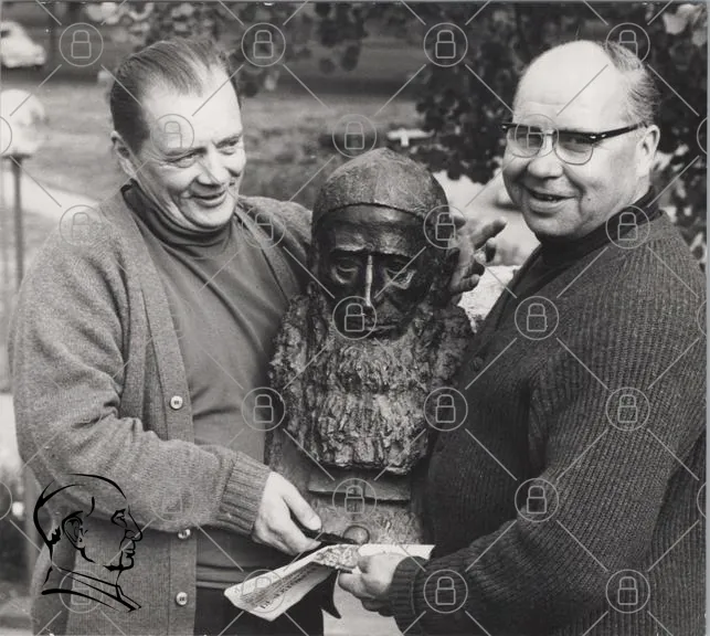 skulptur, staty, män, porträtt, svartvitt, historia, konst, utomhus, vänner, leende, tradition, kultur, 1900-tal, minne, samarbete, fotografi, nostalgi, monument, ansikte, hand, föremål, kläder, uttryck, gemenskap, skulptör, kreativitet, bevarande, arv, identitet, humor