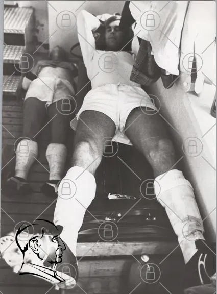 svartvitt, foto, män, sport, träning, shorts, strumpor, liggande, inomhus, 1900-tal, retro, avslappnad, kläder, gym, kropp, muskulös, stil, vintage, aktivitet, grupp, sällskap, tidsepok, nostalgi, interiör, bänk, skåp, fotboll, idrott, kamratskap