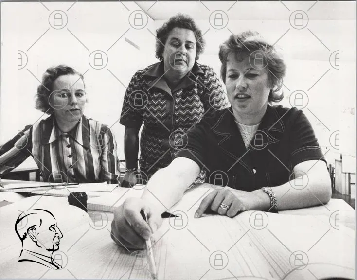 kvinnor, arbete, kontor, 1970-tal, samarbete, ritningar, skrivbord, penna, dokument, mode, svartvitt, diskussion, planering, professionella, arbetsmiljö, historia, team, kreativitet, fokus, engagemang