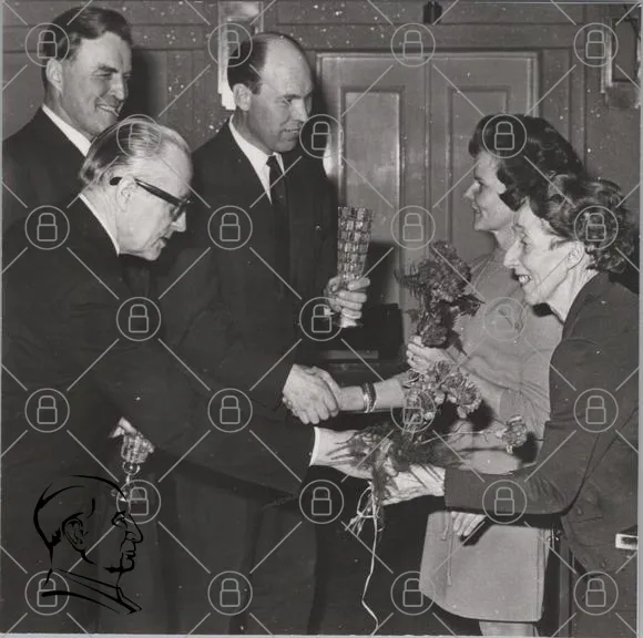 svartvit, fest, blommor, män, kvinnor, handskakning, glas, klänning, kostym, leende, 1960-tal, samling, evenemang, socialt, tradition, gåva, interaktion, jubel, firande, elegans, stil, artighet, vänskap, gemenskap, minnen, historia, fotografi, nostalgi, kultur, festligheter
