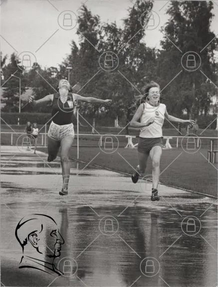 löpning, tävling, sport, kvinnor, regn, asfalt, glädje, motion, träning, 1980-tal, svartvitt, idrott, energi, hastighet, prestation, utomhus, ungdomar, skratt, samarbete, gemenskap