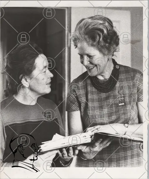 kvinnor, samtal, fotoalbum, svartvitt, vintage, leende, kläder, 1960-tal, vänskap, minnen, dokumentation, interaktion, nostalgi, ansikten, uttryck, gemenskap, historia, familj, bilder, samling, tradition, kultur, generationer, glädje, berättelse, ögonkontakt, samhörighet, skratt, tidlös