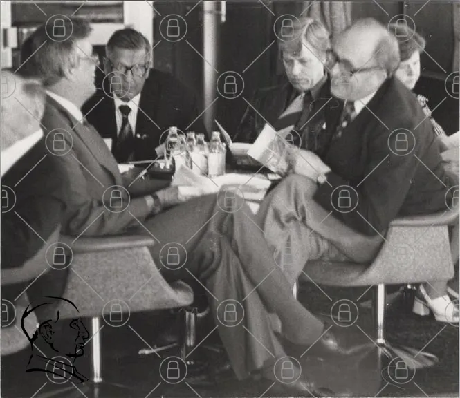 möte, diskussion, män, kostymer, 1970-tal, svartvitt, konferens, papper, glas, stolar, bord, affärsmän, ansikten, dokument, samtal, grupp, professionell, inomhus, kläder, uttryck