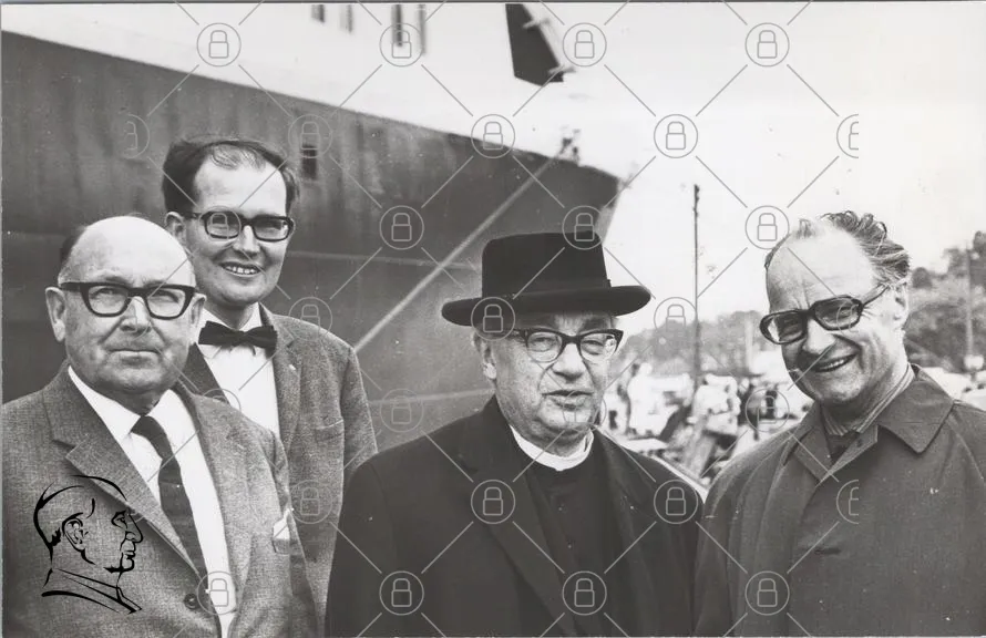 svartvit, foto, män, båt, hamn, kläder, glasögon, hatt, kostym, skägg, 1960-tal, grupp, porträtt, traditionell, maritim, historia, resande, sjöfart, vänner, samling