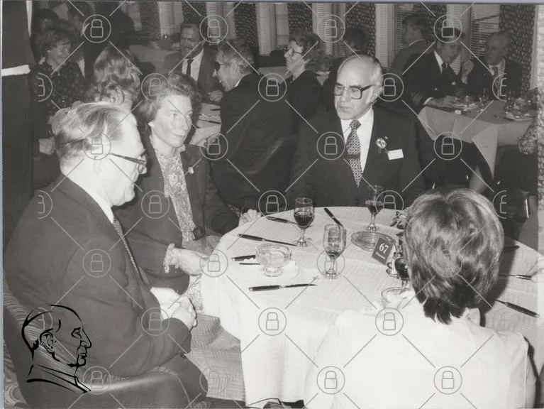 middag, restaurang, människor, samtal, kläder, glas, bord, svartvitt, 1970-tal, affärsmöte, formell, socialt, evenemang, diskussion, mat, dryck, sittande, grupp, professionell, interaktion, stil, elegans, nätverkande, samarbete, tradition, kultur, historia, fest, samling, gemenskap