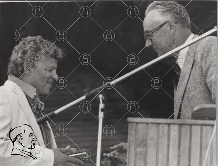 svartvitt, foto, män, ceremon, prisutdelning, kläder, kostymer, leende, talare, publik, scen, 1970-tal, hår, skägg, handskakning, mikrofon, podium, blommor, dokument, gest, uttryck, tradition, evenemang, historia, kultur, samarbete, artister, prestation, minne, festlighet
