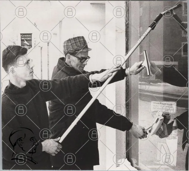 fönsterputs, män, verktyg, butik, 1960-tal, svartvitt, fönster, rengöring, kläder, glas, arbete, professionell, teknik, samarbete, utomhus, affär, traditionell, hantverk, historisk, interaktion, utrustning, fokus, detaljer, miljö, städning, yrke, manuell, service, renlighet