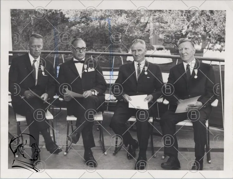svartvitt, män, kostymer, slipsar, medaljer, sittande, ceremoni, gruppfoto, 1960-tal, formella kläder, stolar, utomhus, träd, dokument, ansiktsuttryck, tradition, stil, eleganta, samling, högtidlig, minnen