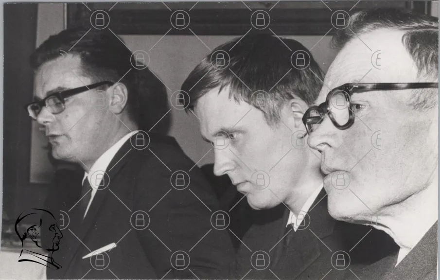 svartvitt, foto, män, 1960-tal, kläder, kostymer, glasögon, allvarliga, möte, diskussion, ansikten, uttryck, historia, retro, dokumentär, grupp, inomhus, sittande, fokus, detaljer, tidsepok