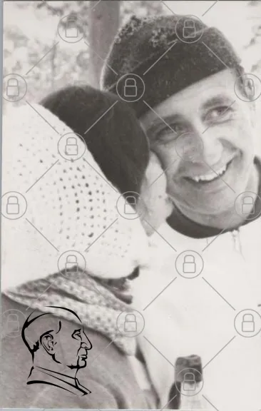 svartvit, foto, leende, person, ansikte, vinter, snö, halsduk, mössa, glädje, närhet, kärlek, par, minne, nostalgi, 1970-tal, sport, aktivitet, utomhus, interaktion, vänskap, skratt, familj, tradition, kultur, gemenskap, värme, omtanke, uttryck, känslor