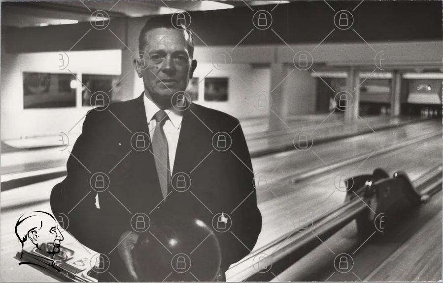 man, bowling, bowlinghall, svartvit, 1950-tal, kläder, hatt, bowlingklot, inomhus, sport, retro, fotografi, stil, leende, trä, banor, socialt, aktivitet, tradition, nostalgi, mänsklig, ansikte, vintage, sportutrustning, rekreation, fritid, gemenskap, tävling