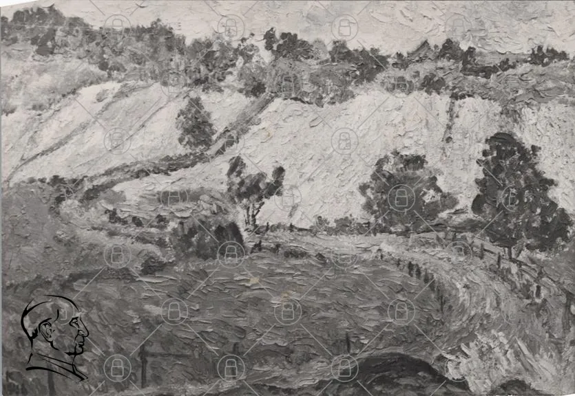 landskap, träd, kullar, gråskala, natur, måleri, konst, landskapmålning, struktur, textur, himmel, jord, staket, vegetation, impressionism, landskapskonst, skugga, ljus, perspektiv, detalj, komposition, konstverk, stil, atmosfär, lugn, harmonisk, avkopplande, traditionell, abstrakt, uttryck