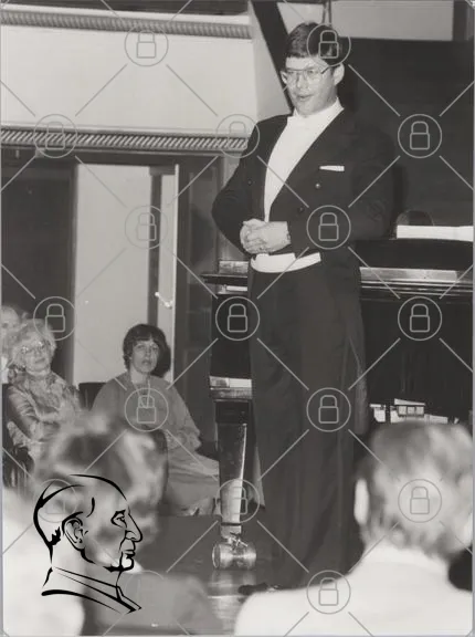 man, talare, publik, piano, svartvitt, kläder, kostym, kvinnor, åhörare, scen, föreställning, 1970-tal, underhållning, presentation, kultur, evenemang, konst, uttryck, gest, fokus, samling, minnen, nostalgisk, socialt, interaktion, artisteri, tradition, stil, elegans, uppträdande