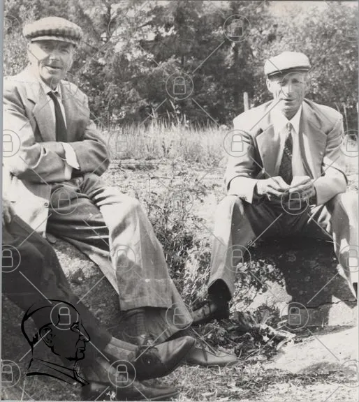 män, kostymer, kepsar, utomhus, sittande, stenar, svartvitt, natur, träd, gräs, vintage, gammaldags, soligt, avslappnat, samtal