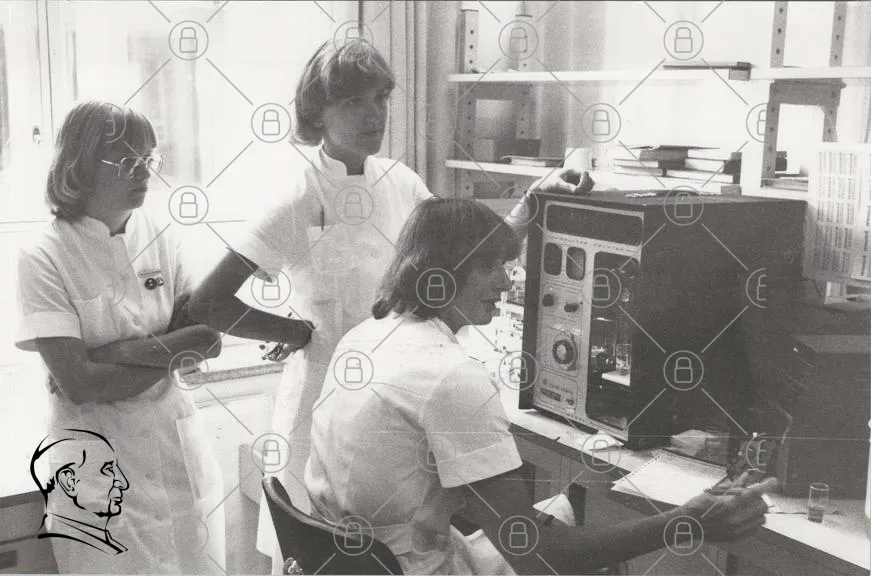 sjukhus, sjuksköterskor, medicinsk utrustning, dator, forskning, 1970-tal, vit uniform, laboratoriemiljö, teknik, medicinsk personal, svartvitt foto, kontor, experiment, hälsa, vetenskap