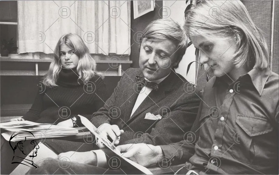 svartvitt, foto, människor, 1970-tal, kläder, inomhus, möte, diskussion, man, kvinna, ungdomar, kontor, stil, retro, ansiktsuttryck, papper, anteckningar, hår, bänk, fönster, dokument, interiör, grupp, samarbete, professionell, uttryck, socialt, samtal, vintage, stil, ängslig