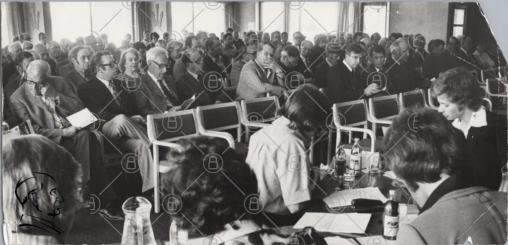 möte, konferens, publik, åhörare, män, kvinnor, kläder, 1970-tal, svartvitt, sittande, diskussion, presentation, lokal, bord, anteckningar, glas, vatten, intresse, samling, evenemang, gemenskap, information, talare, fokus, deltagare, atmosfär, professionell, formell, interaktion, uppmärksamhet