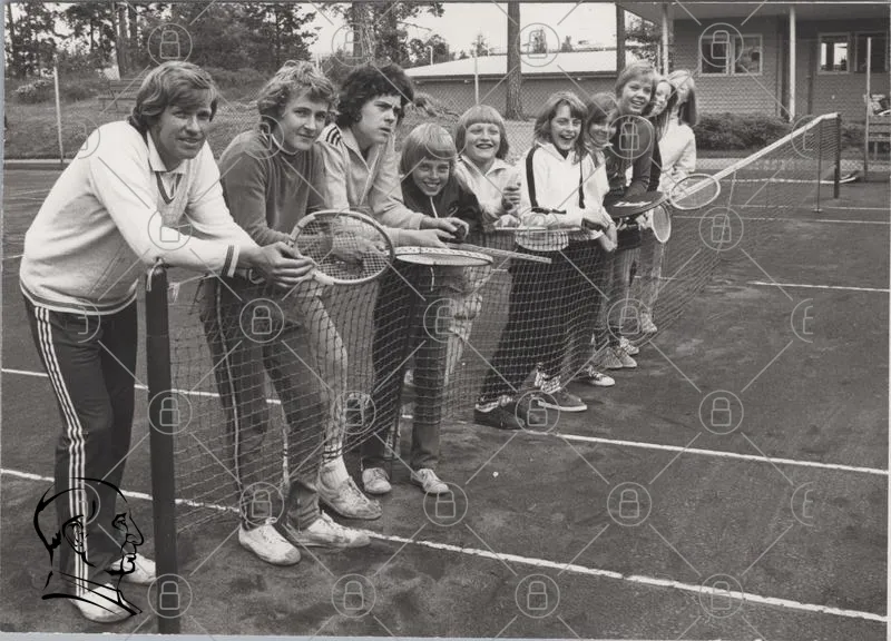 tennis, barn, ungdomar, sport, träning, nät, racketer, utomhus, grupp, leende, 1980-tal, fritid, aktivitet, skola, idrott, kompisar, tävling, glädje, motion, samarbete, tennisbana, svartvitt, fotografering, gemenskap, ungdomssport, tennislektioner, fritidsintressen, ungdomsaktiviteter, sportevenemang