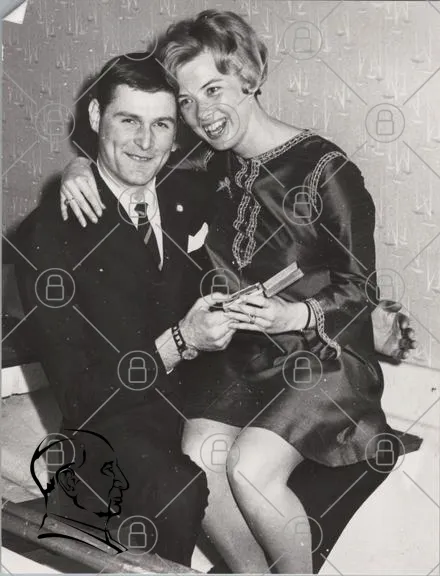 par, man, kvinna, svartvitt, kläder, 1960-tal, leende, sittande, arm, hand, smycken, frisyr, bakgrund, fotografi, porträtt, relation, fest, stil, mode, glädje
