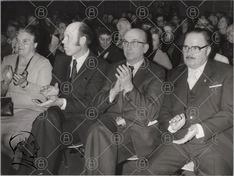 publik, män, kläder, kostymer, åhörare, evenemang, applåder, svartvitt, 1900-tal, konferens, föreläsning, samling, ansiktsuttryck, sittande, mänsklig interaktion, publikreaktion, formell, kultur, historia, samhälle, gemenskap