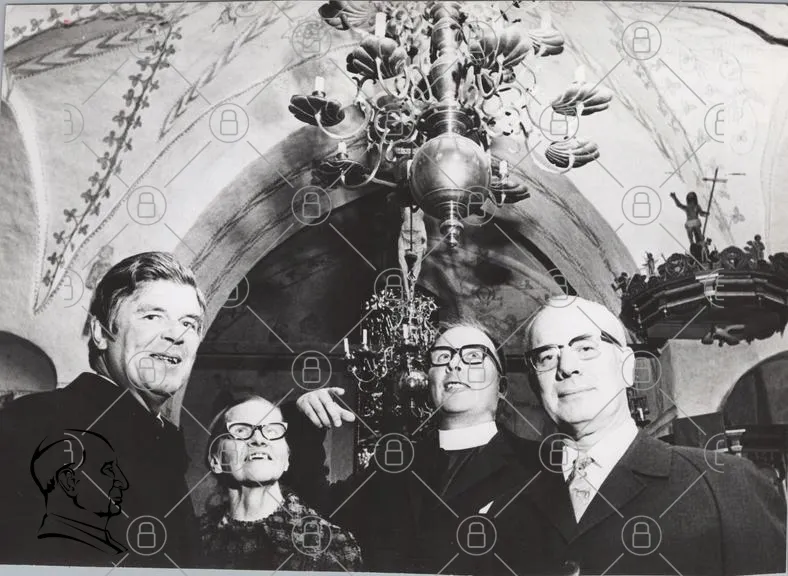 historisk, svartvit, grupp, människor, tak, ljuskrona, glasögon, kläder, inomhus, gammal, kyrka, tradition, samling, leende, fotografi, 1900-tal, interiör, kultur, fest, evenemang, familj