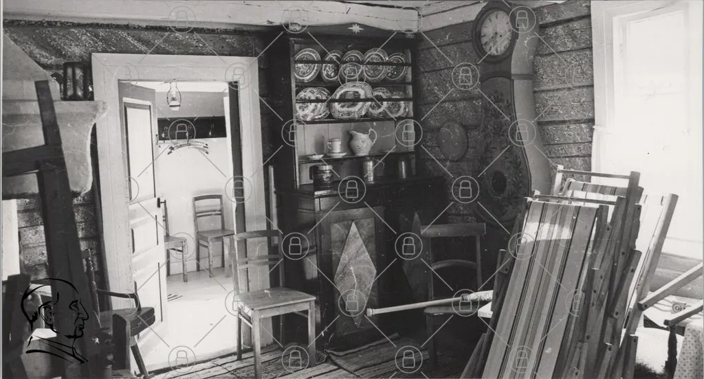 rum, inredning, möbler, stolar, skåp, tallrikar, klocka, vägg, trä, svartvitt, gammaldags, keramik, bord, lampa, golv, mönster, hantverk, traditionell, hem, kök, rustik, dekoration, väggpanel, interiör, vintage, atmosfär, kultur, stil, detaljer