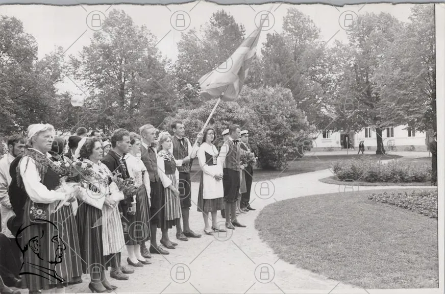 flagga, fest, tradition, kläder, folkdräkt, park, samling, människor, historia, kultur, ceremon, träd, svartvitt, 1940-tal, högtid, gemenskap, ungdomar, nationaldag, firande, utomhus, gruppfoto