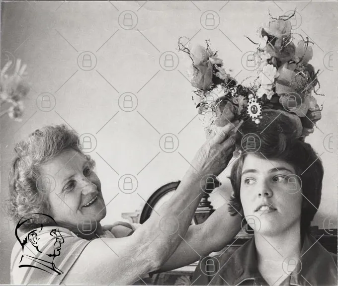 kvinna, gammal, ung, leende, huvudbonad, blommor, svartvitt, porträtt, tradition, familj, glädje, handarbete, vintage, kultur, fest, dekoration, ansikte, uttryck, minne, nostalgi