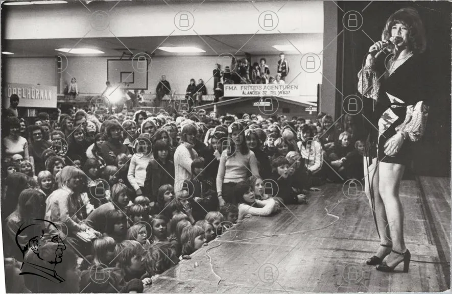 publik, barn, konsert, evenemang, scen, åskådare, 1970-tal, svartvitt, gympasal, underhållning, folkmassa, artister, ljus, mikrofon, kläder, ungdomar, samling, föreställning, glädje, musik, aktivitet, skola, gemenskap, nostalgisk, fotografering, uppträdande, sporthall, kultur, minnen