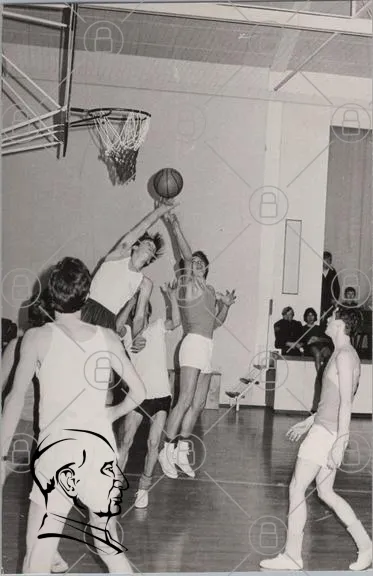basket, sport, ungdomar, tävling, lag, korg, basketboll, gym, träning, 1960-tal, svartvitt, motion, spelare, hopp, åskådare, inomhus, gymnasie, ungdomssport, aktivitet, idrott, samarbete, rivalitet, poäng, skott, basketplan, ungdomslag, sportevenemang, laganda, ungdomar i sport, basketmatch