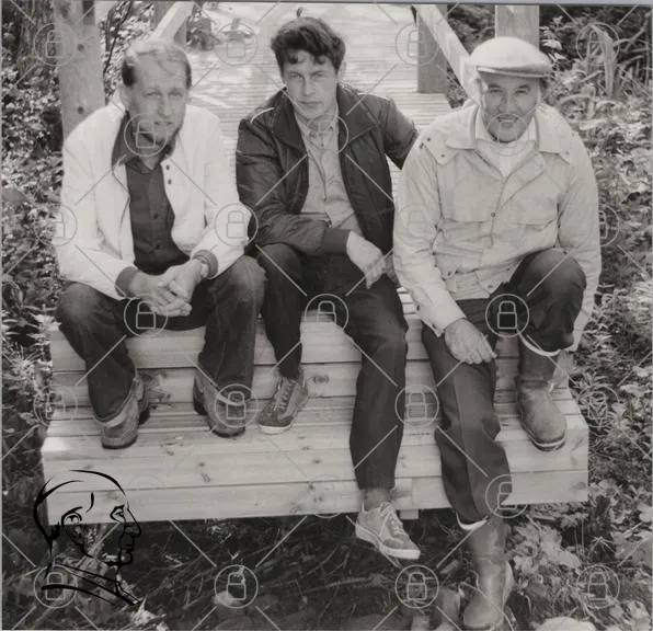 tre män, bänk, skog, natur, svartvitt, kläder, sittande, trä, bro, 1970-tal, ansiktsuttryck, vänskap, utomhus, fotografi, retro, stil, samhörighet, landskap, avslappnad, miljö