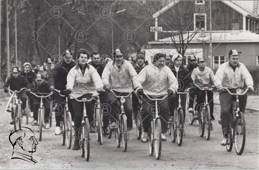 cyklister, svartvitt, grupp, cyklar, gator, kläder, 1980-tal, män, kvinnor, skratt, aktivitet, utomhus, motion, gemenskap, sport, cykeltävling, landskap, träd, byggnader, väg, cykelhjälmar, nostalgi, retro, samarbete, glädje, tradition, evenemang, cykelkultur, cykelåkning, cykelgrupp