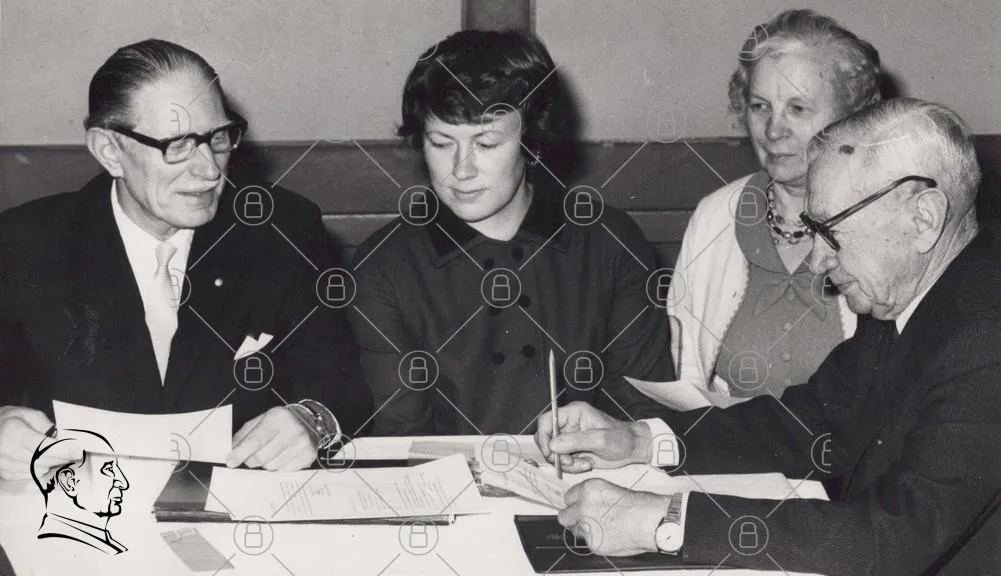 möte, människor, diskussion, dokument, bord, kostym, kavaj, papper, penna, grupp, inomhus, svartvit, 1960-tal, kvinnor, män, formellt, konferens, samarbete, affärsmöte, skrivbord