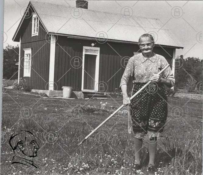 gammal kvinna, stuga, landsbygd, svartvitt, traditionell klädsel, gräsmatta, blomster, verktyg, skog, fönster, tak, skor, rök, trädgård, sommar, natur, svensk kultur, historia, rural, gammal byggnad, hantverk, enkelhet, livsstil, jordbruk, familjetraditioner, nostalgi, landskap, växtlighet, gammal tid
