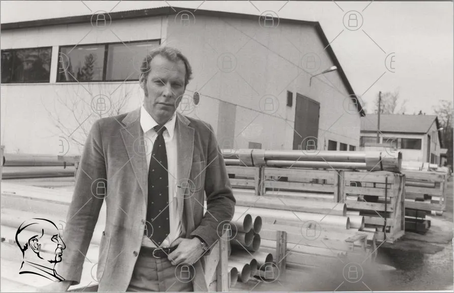 man, kostym, slips, fabrik, byggnad, rör, svartvitt, 1970-tal, industri, utomhus, träd, metall, arbetsplats, professionell, stil, fotografi, retro, europeisk, manlig, affärsmann, stående, pose, kontor, miljö, grå, struktur, detaljer, kläder, ansiktsuttryck, bakgrund