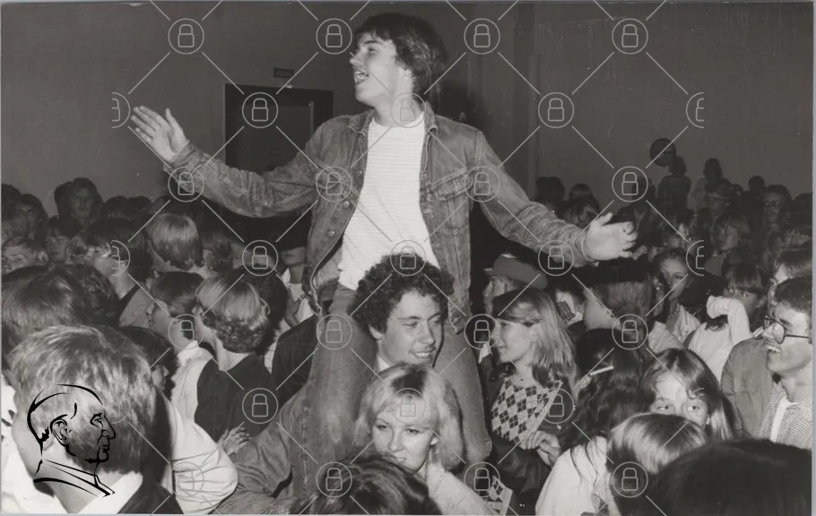 fest, ungdomar, dans, glädje, 1980-tal, svartvitt, samling, skratt, musik, socialt, feststämning, kläder, hårstil, gemenskap, minnen, ungdomskultur, festlokal, vänner, aktivitet, roligt, nostalgiskt, ungdomsfest, kroppsspråk, ansiktsuttryck, interaktion, samvaro, festkläder, ungdomlig, livlig, energisk