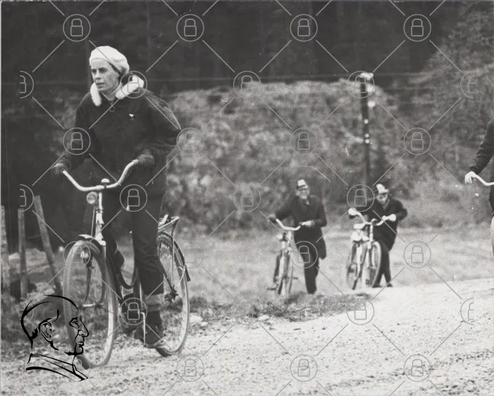 cyklar, kvinnor, svartvitt, landskap, väg, skog, kläder, 1930-tal, cykling, motion, natur, historisk, fotografering, grupp, utomhus, sport, retro, cykelhjälm, stil, aktivitet, fritid