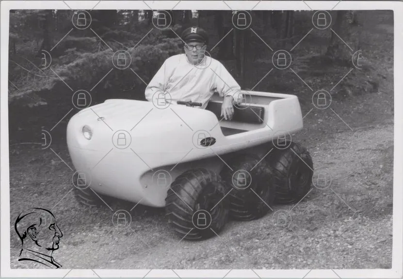 man, bil, skog, gummi, däck, vintage, fordon, sittande, natur, svartvit, 1960-tal, design, teknik, transport, fritid, utemiljö, leksak, unik, kreativ, retro