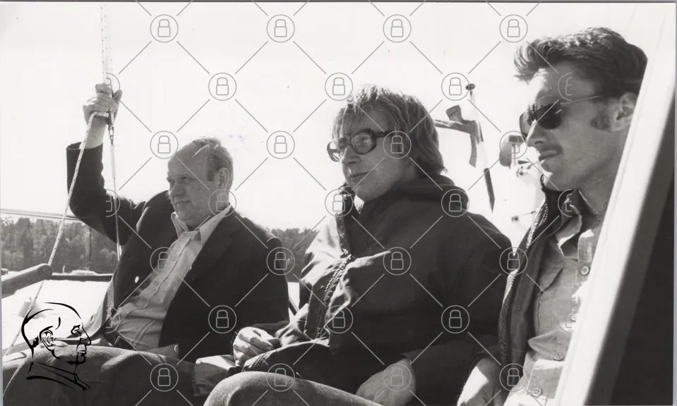 tre personer, svartvitt, utomhus, samtal, kläder, glasögon, man, kvinna, sittande, bakgrund, natur, ansikten, uttryck, 1970-tal, vintage, fotografi, grupp, socialt, interaktion, stil, casual, leende, avslappnad, miljö, historisk, nostalgi, kultur, samling