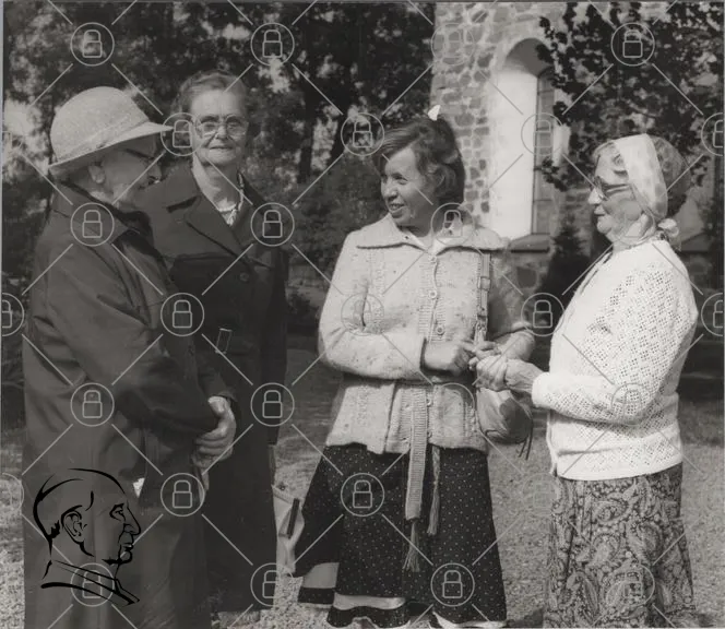 kvinnor, svartvitt, vintage, kläder, 1960-tal, samtal, leende, trädgård, hattar, glasögon, stickad tröja, kjol, socialt, historiskt, porträtt, vänner, samling, utomhus, ansikten, mode
