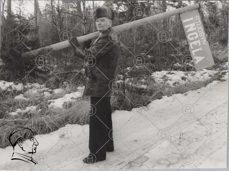 man, skylt, Ingela, vinter, snö, skog, trä, kläder, hatt, svartvitt, väg, landskap, natur, gammal, tradition, kultur, historia, fotografering, utomhus, person, hållande, skyltning, landsbygd, svensk, vintage, porträtt, stil, 1900-tal, identifiering, samhälle