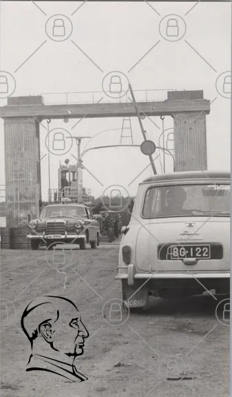 färja, bil, bro, väg, transport, 1960-tal, svartvitt, hamn, lastbil, trä, betong, landskap, fordon, trafik, skylt, BG-122, gammal, resa, motor, sjö, last, passagerare, kaj, byggnad, maskin, vägskylt, historisk, foto, retro