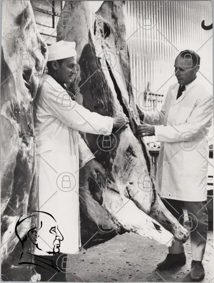 slaktare, kött, djur, industri, arbete, vit rock, köttstycke, man, historisk, svartvitt, professionell, mat, livsmedel, hantverk, tradition, forskning, teknik, presentation, skärning, detalj, köttproduktion, livsmedelsindustri, arbetsmiljö, samarbete, utbildning, expertis, kvalitet, hygien, säkerhet, process