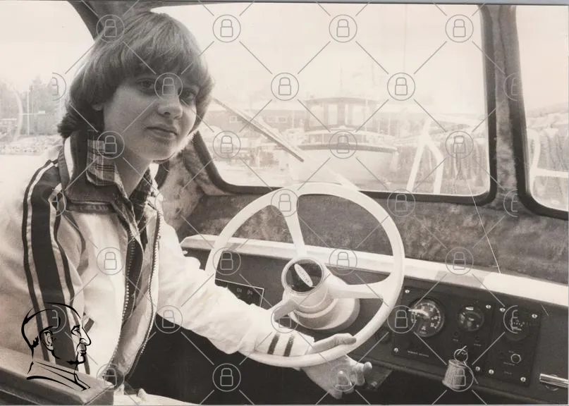 pojke, båt, rat, hamn, svartvitt, marina, ungdom, segling, fritid, kläder, inredning, båtliv, sommar, nöje, vatten, båtkapten, ungdomar, båtdäck, segelbåt, motorbåt, båtförare, fotografi, nostalgi, 1970-tal, stil, äventyr, natur, landskap, hobby, transport